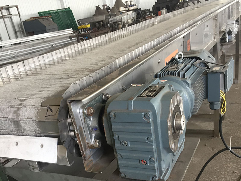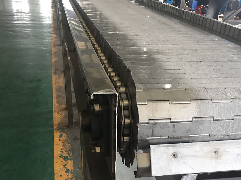 鏈板輸送機是一種以標(biāo)準(zhǔn)鏈板為承載面,由馬達減速機為動力傳動的傳送裝置。鏈板式輸送機,由動力裝置(電機)、傳動軸、滾筒、張緊裝置、鏈輪、鏈條、軸承、潤滑劑、鏈板等等構(gòu)成。其中帶動物料的輸送的主要的兩個部分為:鏈條,利用它的循環(huán)往復(fù)運動提供牽引動力;金屬板,作為輸送過程中的承載體。